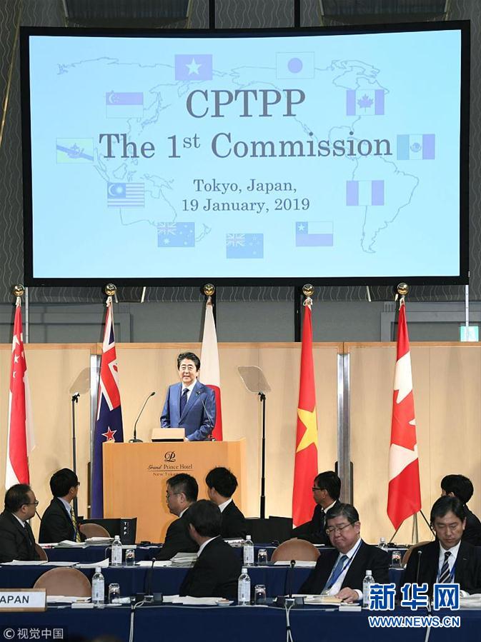 当地时间2019年1月19日,日本东京,跨太平洋伙伴关系协定(TPP)11个成员国部长级会议在东京举行,日本首相安倍晋三出席。(图片来源:视觉中国)