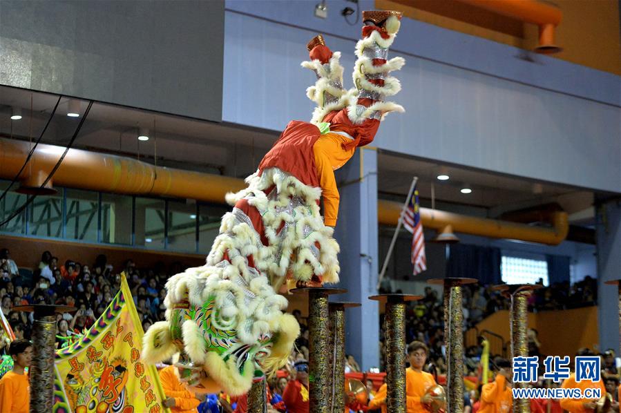 1月19日,在马来西亚沙巴州首府哥打基纳巴卢,演员表演高桩舞狮。