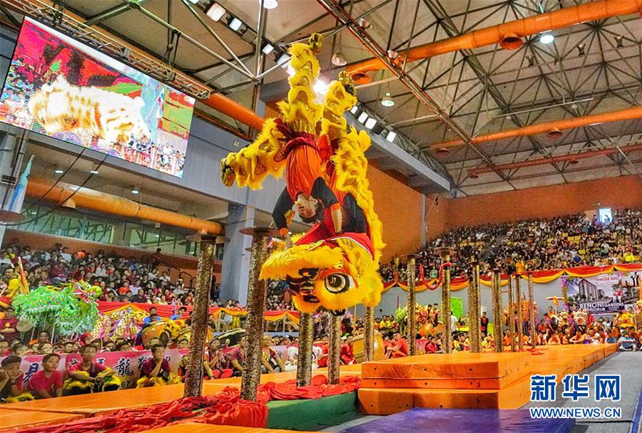 1月19日,在马来西亚沙巴州首府哥打基纳巴卢,演员表演高桩舞狮。