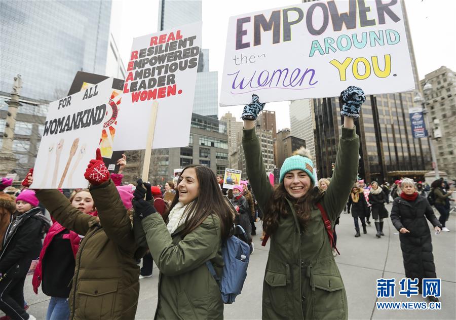 当日,数万人走上纽约街头参加2019妇女大游行,呼吁实现男女平等,表达对保障妇女、移民及其他弱势群体权益的支持。