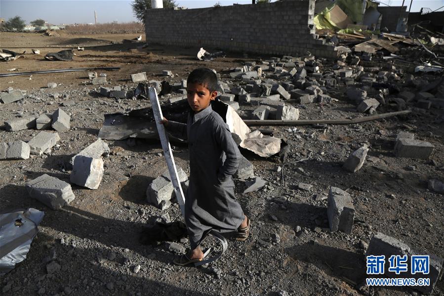 1月20日,在也门萨那,一名男孩在遭空袭的房屋附近活动。