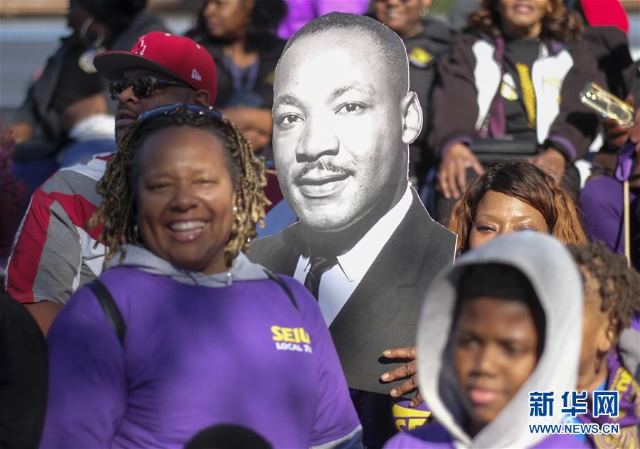 1月21日,在美国洛杉矶,人们参加马丁·路德·金纪念日游行活动。新华社发(赵汉荣摄)