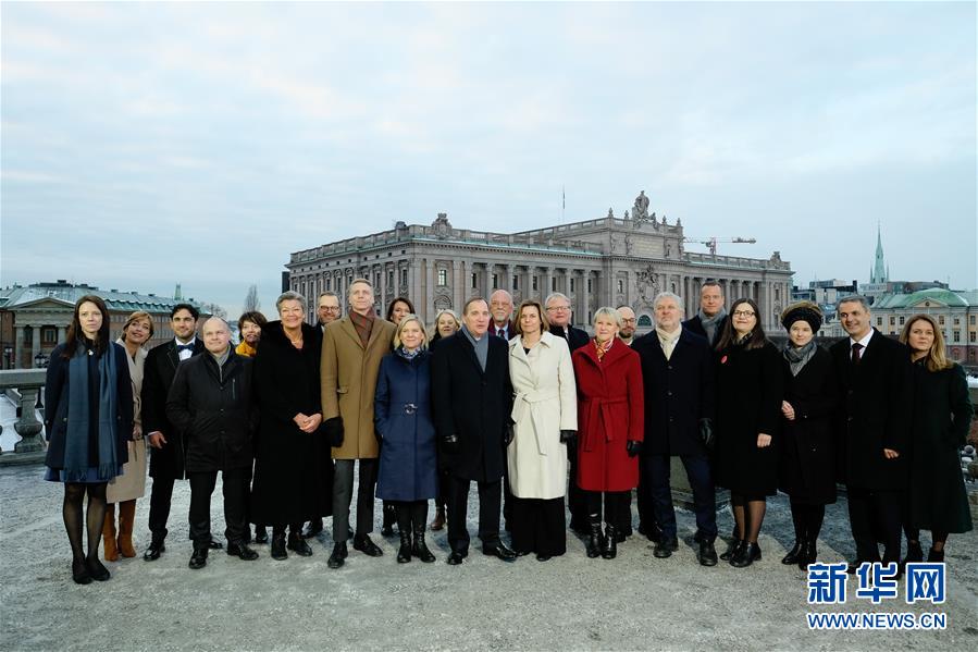 这是1月21日在瑞典首都斯德哥尔摩拍摄的新任瑞典首相斯特凡·勒文(中)和新一届政府成员。