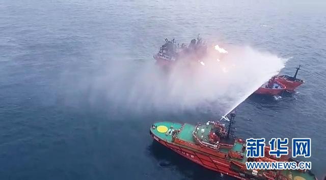 1月22日,在刻赤海峡附近水域,救援船只在起火货轮旁灭火。 俄罗斯联邦海洋和河流运输局22日表示,21日在刻赤海峡发生的货轮起火事故中的失踪人员已无生还希望。