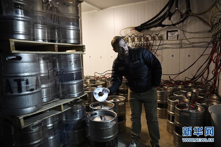 1月17日,在美国首都华盛顿,一家精酿啤酒工坊的负责人考克斯展示酒烟税务和贸易局“停摆”前获批的罐装商标。新款啤酒的罐装商标先前已获批,桶装啤酒的商标因政府“停摆”悬而未决。