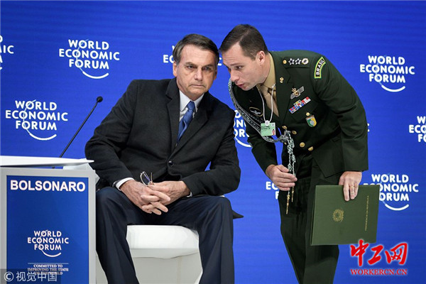 当地时间2019年1月22日,瑞士达沃斯,巴西右翼总统博尔索纳罗参加世界经济论坛年会。他表示,想通过此次论坛,将“新巴西”展示给全世界看。报道称,博尔索纳罗表示:“想展示巴西正在采取措施,让世界重新建立对我们的信心”。他告诉记者,巴西希望扩大与其他国家的贸易,他确信巴西政府将成功地将国有企业私有化。由于美国总统特朗普和其他几位知名国家元首缺席达沃斯论坛,这位拉美最大经济体的新极右翼领导人成为了本次达沃斯备受瞩目的明星。