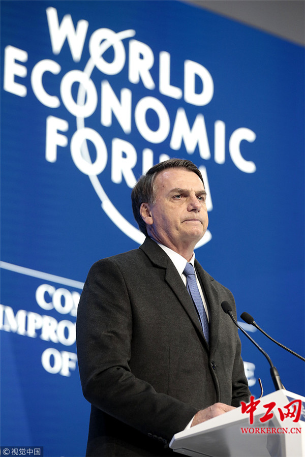 当地时间2019年1月22日,瑞士达沃斯,巴西右翼总统博尔索纳罗参加世界经济论坛年会。他表示,想通过此次论坛,将“新巴西”展示给全世界看。报道称,博尔索纳罗表示:“想展示巴西正在采取措施,让世界重新建立对我们的信心”。他告诉记者,巴西希望扩大与其他国家的贸易,他确信巴西政府将成功地将国有企业私有化。由于美国总统特朗普和其他几位知名国家元首缺席达沃斯论坛,这位拉美最大经济体的新极右翼领导人成为了本次达沃斯备受瞩目的明星。