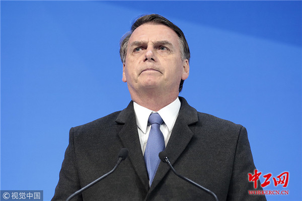 当地时间2019年1月22日,瑞士达沃斯,巴西右翼总统博尔索纳罗参加世界经济论坛年会。他表示,想通过此次论坛,将“新巴西”展示给全世界看。报道称,博尔索纳罗表示:“想展示巴西正在采取措施,让世界重新建立对我们的信心”。他告诉记者,巴西希望扩大与其他国家的贸易,他确信巴西政府将成功地将国有企业私有化。由于美国总统特朗普和其他几位知名国家元首缺席达沃斯论坛,这位拉美最大经济体的新极右翼领导人成为了本次达沃斯备受瞩目的明星。