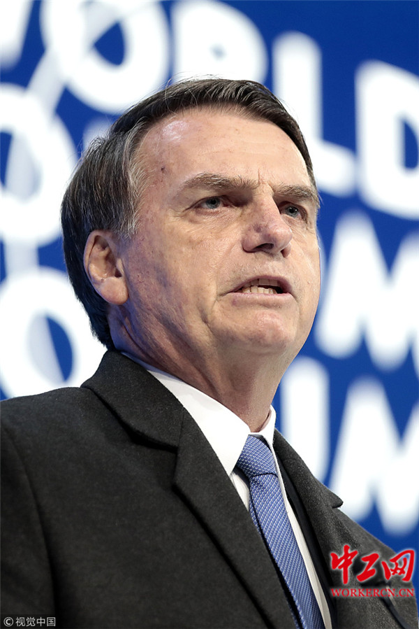 当地时间2019年1月22日,瑞士达沃斯,巴西右翼总统博尔索纳罗参加世界经济论坛年会。他表示,想通过此次论坛,将“新巴西”展示给全世界看。报道称,博尔索纳罗表示:“想展示巴西正在采取措施,让世界重新建立对我们的信心”。他告诉记者,巴西希望扩大与其他国家的贸易,他确信巴西政府将成功地将国有企业私有化。由于美国总统特朗普和其他几位知名国家元首缺席达沃斯论坛,这位拉美最大经济体的新极右翼领导人成为了本次达沃斯备受瞩目的明星。