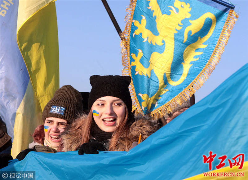 乌克兰庆祝统一日 民众身披国旗参加游行