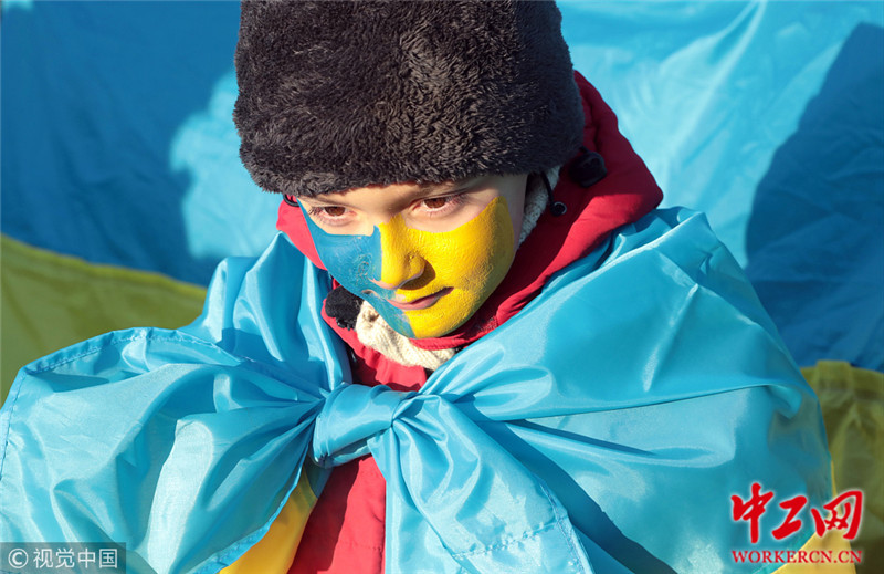 乌克兰庆祝统一日 民众身披国旗参加游行