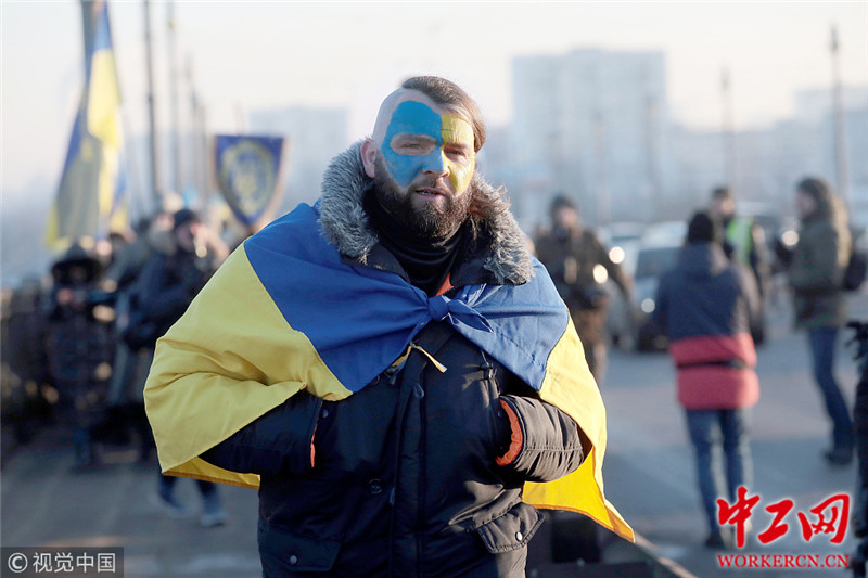乌克兰庆祝统一日 民众身披国旗参加游行