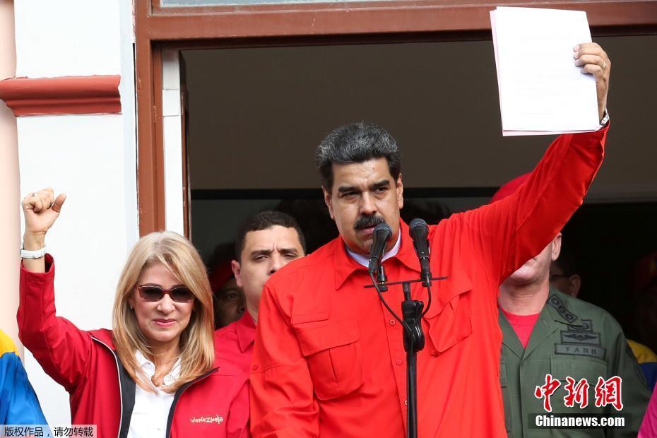 当地时间1月23日下午,委内瑞拉总统马杜罗宣布与美国断交,并要求美使馆人员72小时内离开委内瑞拉。据外媒报道,23日,委内瑞拉反对党派在首都加拉加斯发起大规模游行,反对党领袖、委内瑞拉议会主席瓜伊多宣称为该国“临时总统”,随即美国总统特朗普以及拉美多国领导人表示承认,引发马杜罗强烈不满。图为当地时间1月23日,委内瑞拉总统马杜罗在首都加拉加斯参加集会并发表讲话。