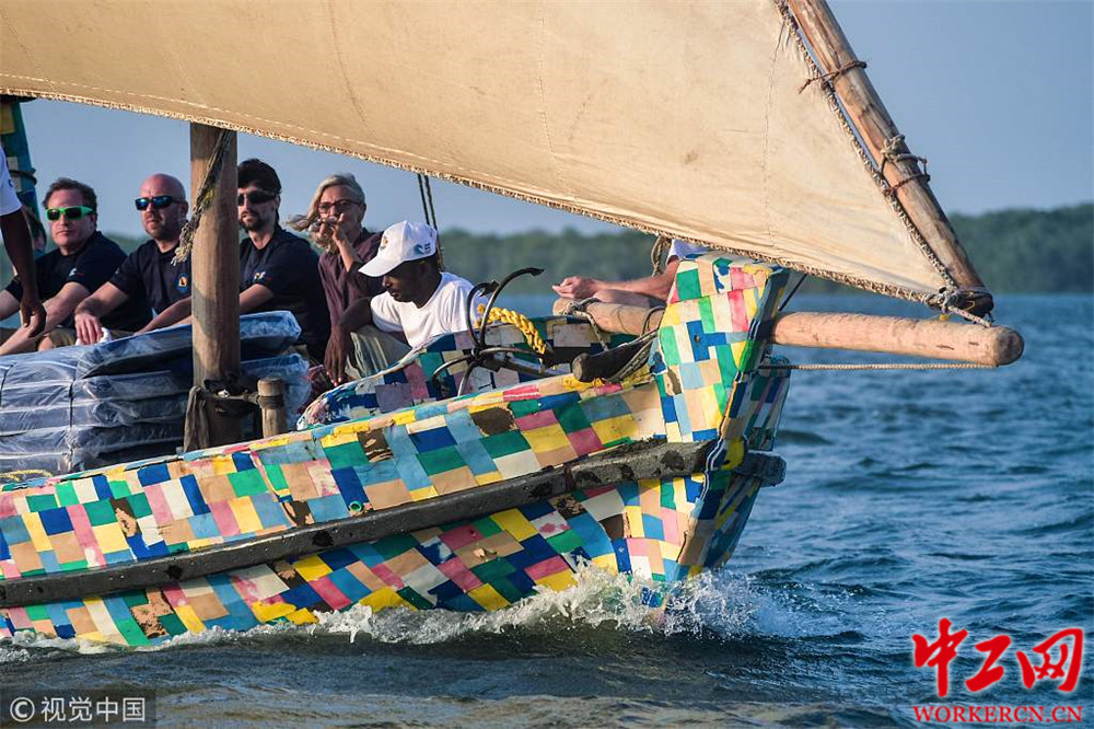 当地时间2019年1月23日,肯尼亚拉姆岛,世界上第一艘完全由塑料垃圾制成的单桅帆船扬帆出海,航行500公里最终抵达坦桑尼亚的桑给巴尔岛(Zanzibar),此次航行旨在凸显海洋垃圾泛滥成灾的问题。