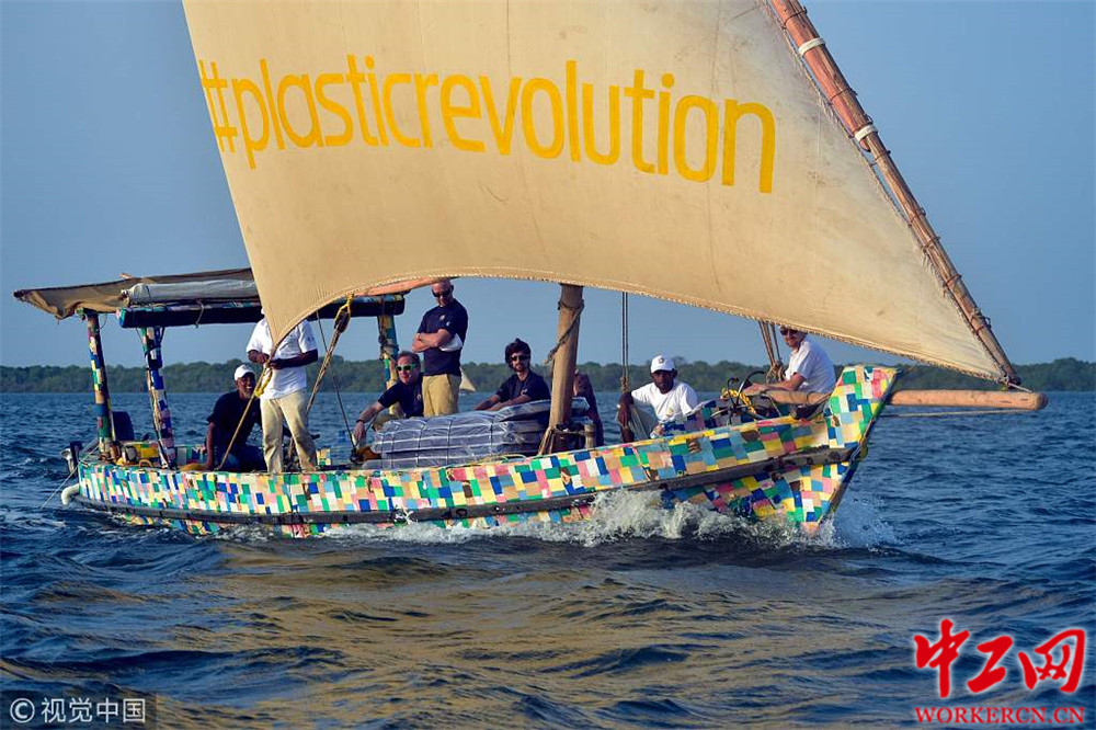 当地时间2019年1月23日,肯尼亚拉姆岛,世界上第一艘完全由塑料垃圾制成的单桅帆船扬帆出海,航行500公里最终抵达坦桑尼亚的桑给巴尔岛(Zanzibar),此次航行旨在凸显海洋垃圾泛滥成灾的问题。