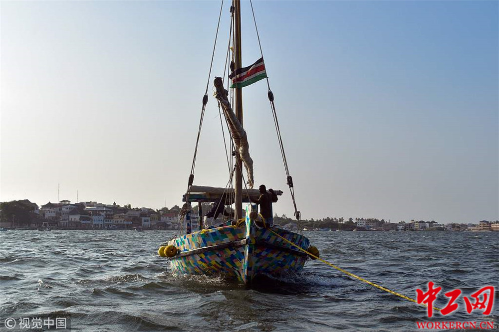 当地时间2019年1月23日,肯尼亚拉姆岛,世界上第一艘完全由塑料垃圾制成的单桅帆船扬帆出海,航行500公里最终抵达坦桑尼亚的桑给巴尔岛(Zanzibar),此次航行旨在凸显海洋垃圾泛滥成灾的问题。