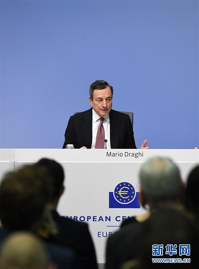 1月24日,在德国法兰克福的欧洲中央银行总部,欧洲央行行长德拉吉出席新闻发布会。 欧洲中央银行24日在法兰克福宣布,继续维持欧元区关键利率水平不变,并预期在2019年夏天前不会加息。欧洲央行同时表示,欧元区经济增长前景的风险平衡已转向下行。 新华社记者 逯阳 摄