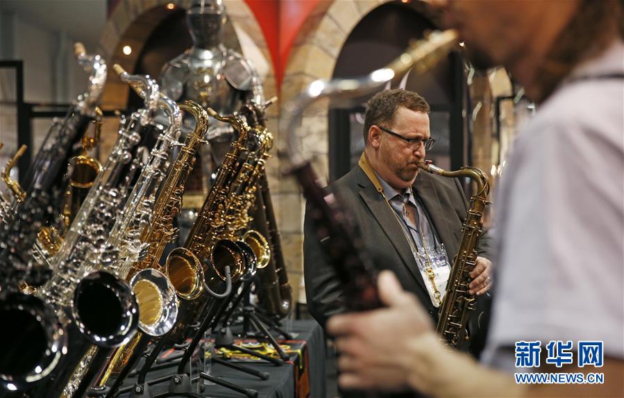 1月24日,在美国加利福尼亚州阿纳海姆,两名男子在乐器展上演奏。 2019年度美国阿纳海姆国际乐器、舞台灯光及音响展览会(简称美国乐器展)24日在加利福尼亚州阿纳海姆会展中心拉开帷幕。 新华社记者李颖摄