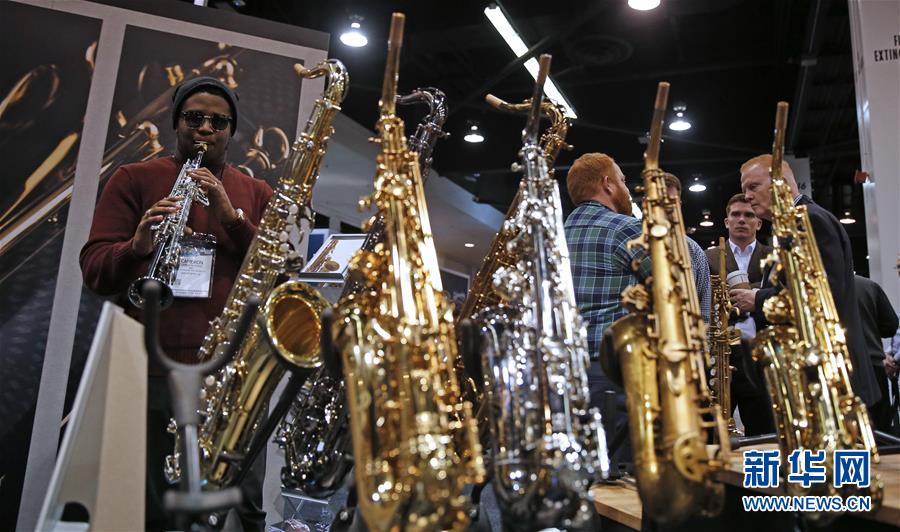 1月24日,在美国加利福尼亚州阿纳海姆,一名男子在乐器展上演奏。 2019年度美国阿纳海姆国际乐器、舞台灯光及音响展览会(简称美国乐器展)24日在加利福尼亚州阿纳海姆会展中心拉开帷幕。 新华社记者李颖摄