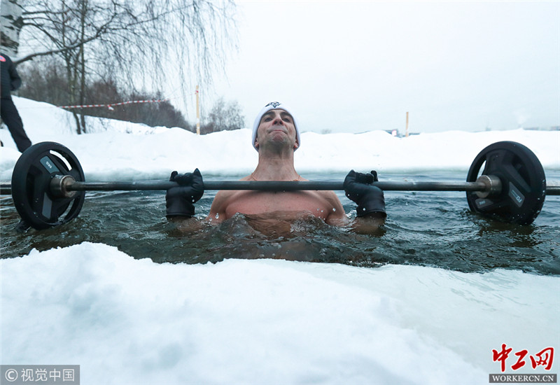 当地时间2019年1月27日,俄罗斯圣彼得堡,吉尼斯世界纪录保持者安德烈·洛布科夫当日打破了在冰洞中举起杠铃的记录。这一记录将在俄罗斯国内被登记。