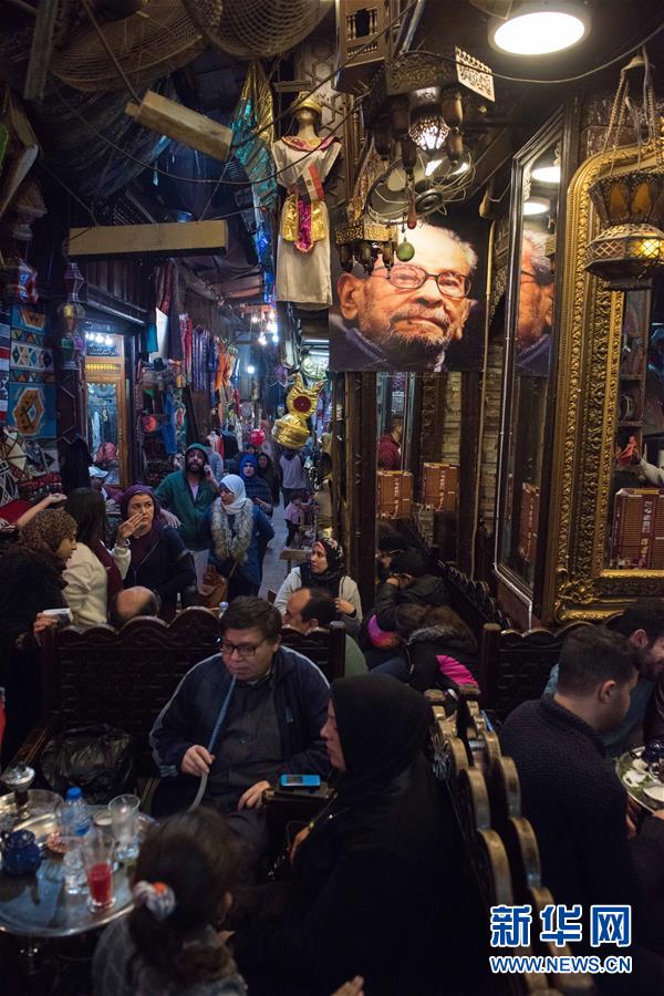 1月25日,埃及首都开罗,人们在老城哈里里市场一家以马赫福兹为主题的咖啡馆享受休闲时光。新华社记者 孟涛摄