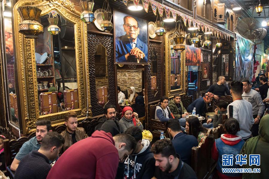1月25日,埃及首都开罗,人们在老城哈里里市场一家以马赫福兹为主题的咖啡馆享受休闲时光。新华社记者 孟涛摄