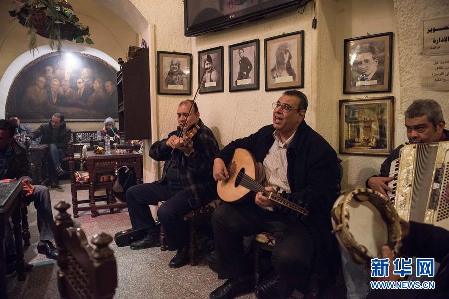 1月27日,埃及首都开罗,演奏者在哈拉费什咖啡馆弹唱阿拉伯音乐。左侧壁画处为咖啡馆设立的"马赫福兹角"。 新华社记者 孟涛摄