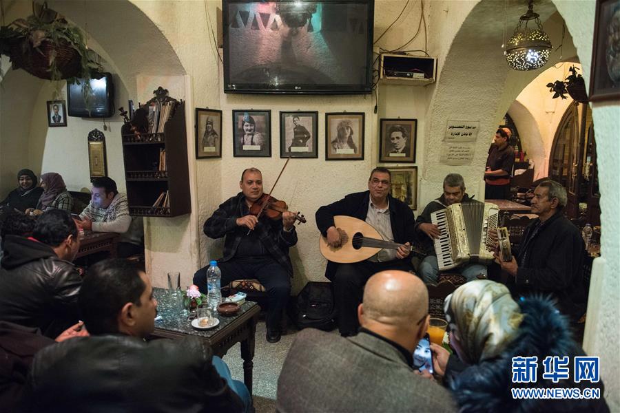 1月27日,埃及首都开罗,人们在哈拉费什咖啡馆聆听阿拉伯音乐现场弹唱。新华社记者 孟涛摄