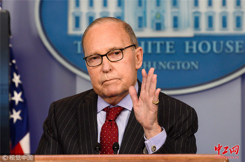 当地时间2019年1月28日,美国华盛顿,国家经济委员会主任拉里·库德洛、白宫新闻秘书萨拉·桑德斯、美国财政部长史蒂文·姆努钦(Steven Mnuchin)、国家安全顾问约翰·博尔顿等政府高级官员在白宫出席新闻发布会并接受记者提问。当日,白宫宣布对委内瑞拉国有石油公司实施经济制裁,以迫使马杜罗下台。