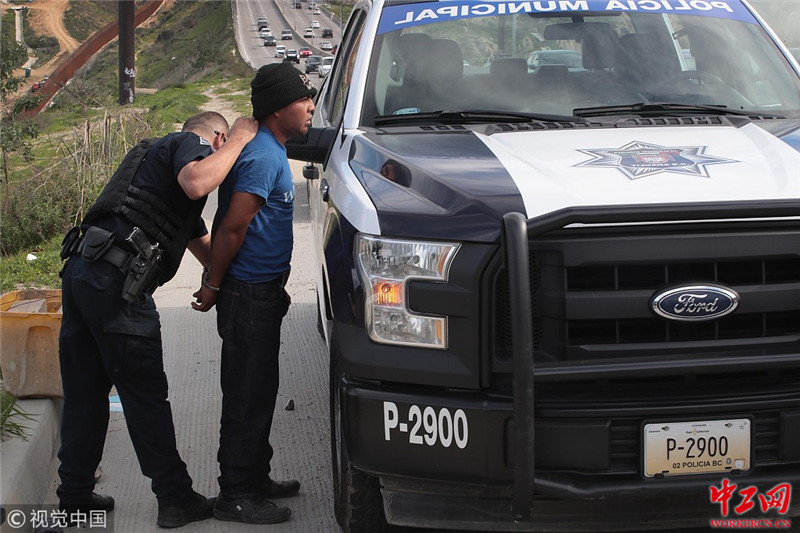 当地时间2019年1月28日,墨西哥蒂华纳,一名危地马拉移民被警方拘留。这名男子最近随一群中美洲移民车队前往墨西哥,他当时住在美国边境围栏附近,等待进入美国的机会,目前还不清楚他被拘留的原因。
