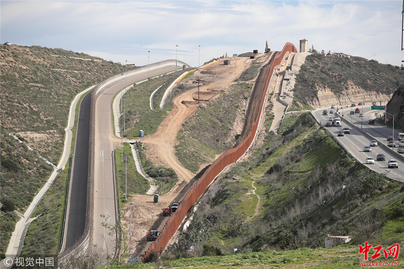当地时间2019年1月28日,墨西哥蒂华纳,一段正在修建的美墨边境墙。