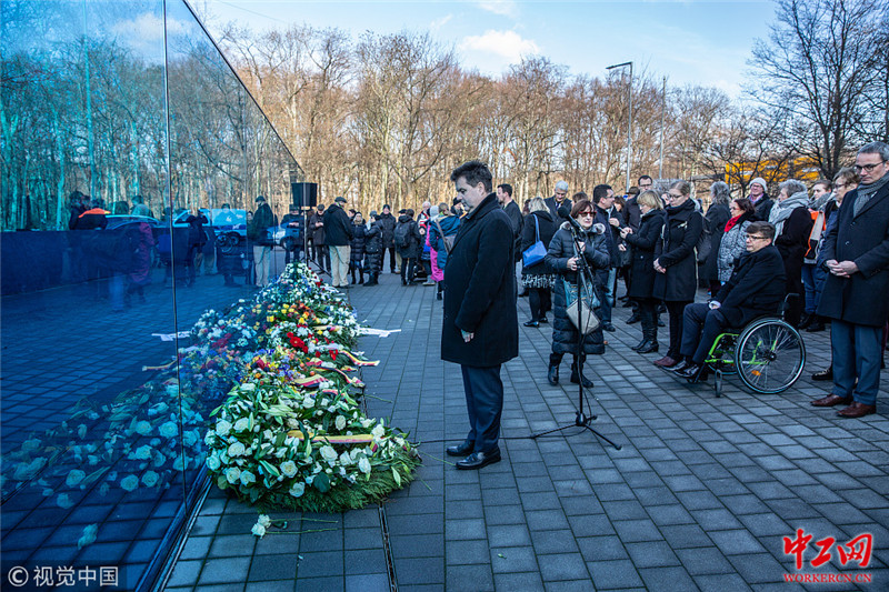 当地时间2019年1月28日,德国柏林,民众为在第二次世界大战期间被纳粹实施安乐死的受害者举行献花圈纪念仪式。