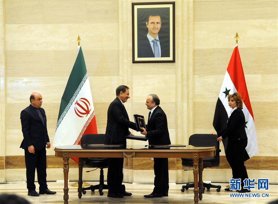 1月28日,在叙利亚首都大马士革,叙利亚总理伊马德·哈米斯(右二)与伊朗第一副总统埃沙格·贾汉吉里(左二)握手。 叙利亚总理伊马德·哈米斯28日表示,叙利亚同伊朗当天签订涉及多个领域的长期经济合作协议,双方还就银行业合作、发电站和港口建设等达成协议。 新华社发(阿马尔摄)