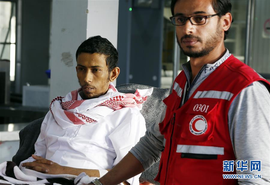 1月29日,在也门萨那机场,被释放的沙特阿拉伯籍战俘(左)等候登机。 新华社发(穆罕默德摄)