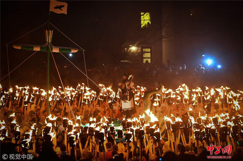 当地时间2019年1月29日,英国设得兰群岛勒威克,向维京时代的历史表达敬意。Helly-Aa意为最后的圣洁之日。为了庆祝该节日,当地人穿着古维京人的服饰,并在庆祝仪式中点燃一个仿制的巨型维京战舰。