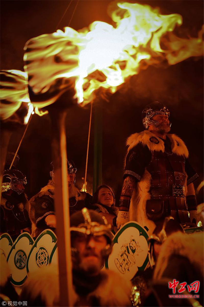 当地时间2019年1月29日,英国设得兰群岛勒威克,向维京时代的历史表达敬意。Helly-Aa意为最后的圣洁之日。为了庆祝该节日,当地人穿着古维京人的服饰,并在庆祝仪式中点燃一个仿制的巨型维京战舰。