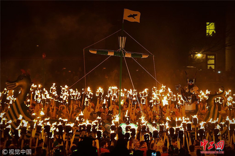当地时间2019年1月29日,英国设得兰群岛勒威克,向维京时代的历史表达敬意。Helly-Aa意为最后的圣洁之日。为了庆祝该节日,当地人穿着古维京人的服饰,并在庆祝仪式中点燃一个仿制的巨型维京战舰。