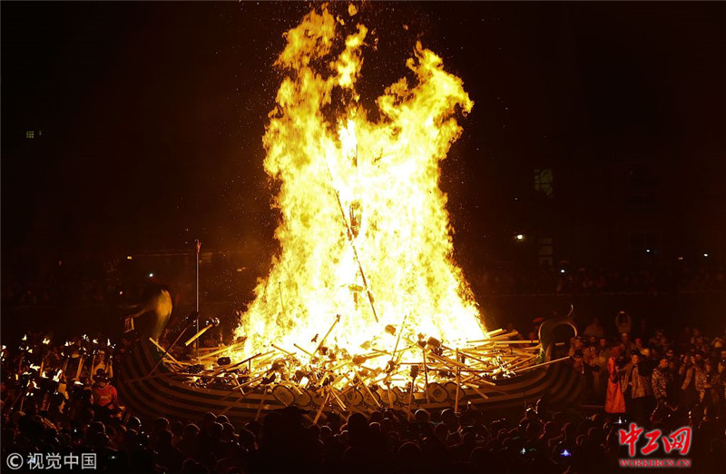 当地时间2019年1月29日,英国设得兰群岛勒威克,向维京时代的历史表达敬意。Helly-Aa意为最后的圣洁之日。为了庆祝该节日,当地人穿着古维京人的服饰,并在庆祝仪式中点燃一个仿制的巨型维京战舰。