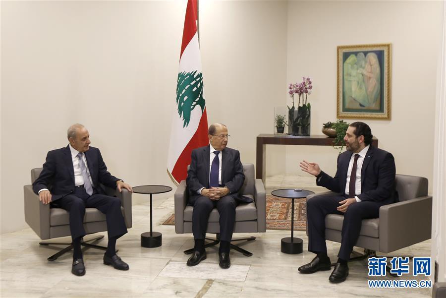 1月31日,在黎巴嫩首都贝鲁特总统府,黎巴嫩总统米歇尔⋅奥恩(中)与总理萨阿德⋅哈里里(右)、议长纳比⋅贝里讨论组阁事宜。 黎巴嫩新一届内阁31日组建完成,萨阿德⋅哈里里再次出任总理。 新华社发(比拉尔⋅贾维希摄)