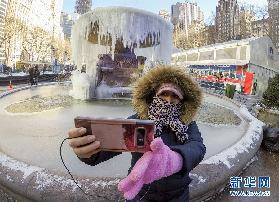 1月31日,在美国纽约布赖恩特公园,一名女子在结冰的喷泉前拍照。 从30日起,受“极地涡旋”影响,纽约大幅降温。 新华社记者 王迎 摄