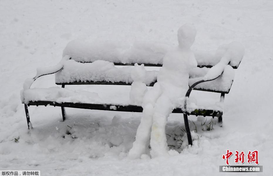 当地时间2月1日,英国迎来降雪天气,大地一片银装素裹。图为英国布里斯托尔的公园内,一处长椅上堆出雪人。