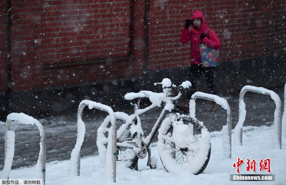 当地时间2月1日,英国迎来降雪天气,大地一片银装素裹。图为英国布里斯托尔的自行车存放处被大雪覆盖。
