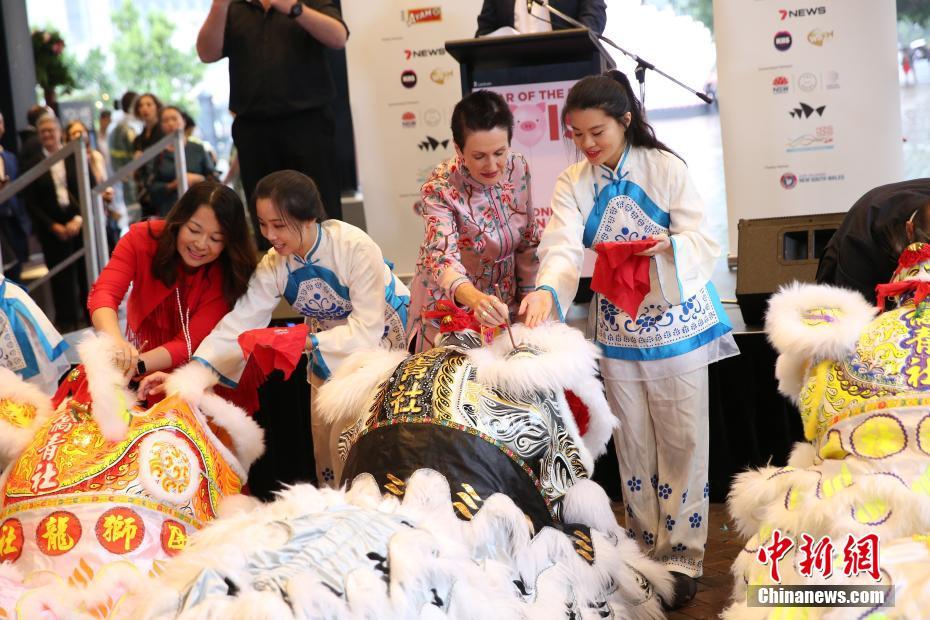 2月1日傍晚,悉尼农历节(Sydney Lunar Festival)拉开帷幕。图为悉尼市长克罗芙·摩尔(右二)为醒狮点睛。中新社记者 陶社兰 摄