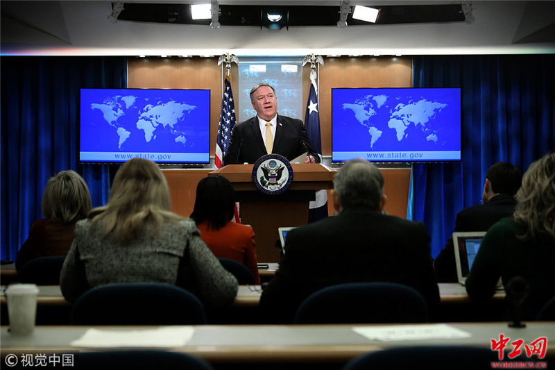 当地时间2019年2月1日,美国华盛顿,美国国务卿蓬佩奥在国务院举行新闻发布会宣布将于2日起暂停履行《中导条约》义务。美国国务院2月1日宣布,美国将于2日起暂停履行《中导条约》义务,启动退约程序。