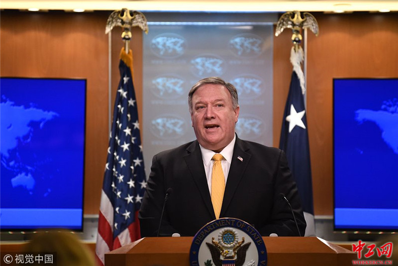 当地时间2019年2月1日,美国华盛顿,美国国务卿蓬佩奥在国务院举行新闻发布会宣布将于2日起暂停履行《中导条约》义务。美国国务院2月1日宣布,美国将于2日起暂停履行《中导条约》义务,启动退约程序。