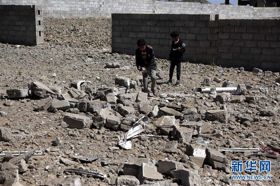 2月1日,在也门萨那,孩子站在空袭后的房屋废墟上。