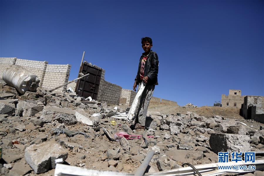 2月1日,在也门萨那,一个男孩站在空袭后的房屋废墟上。