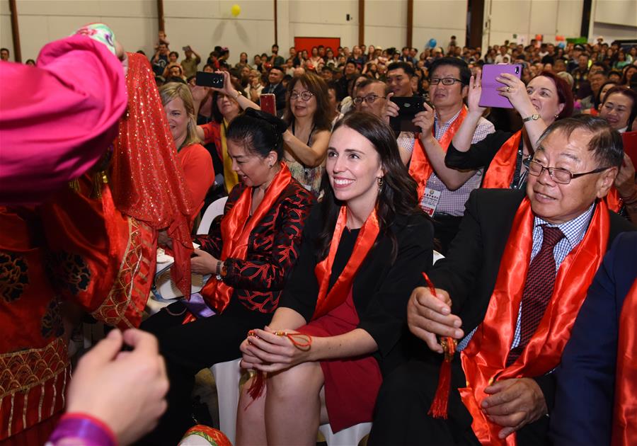 2月2日,在新西兰奥克兰,新西兰总理阿德恩(中)在“新春花市同乐日”活动上观看杂技表演。