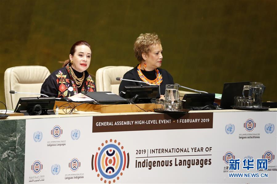 2月1日,在位于纽约的联合国总部,第73届联大主席埃斯皮诺萨(左)在“土著语言国际年”启动仪式上讲话。