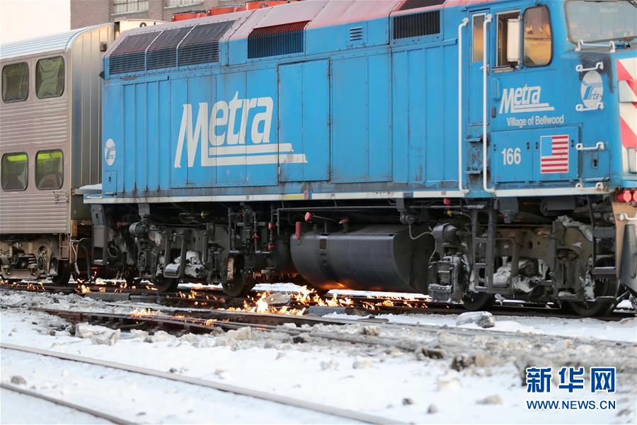 2月1日,在美国芝加哥的西部大道车站,一辆火车从“着火”的铁轨上驶过。 连日来,严寒天气肆虐美国中西部和东部地区。芝加哥在1月30日出现零下30摄氏度的极低气温。铁轨因寒冷而收缩,甚至冻裂,铁路工作人员通过“火烧铁轨”使铁轨复原,以确保铁路交通正常运转。 新华社记者 汪平 摄